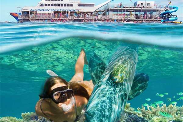 【大堡礁】是世界最大最长的堡礁群。它纵贯昆士兰州外的珊瑚海,绵延伸展共260多公里。因为得天独厚的环境,这里的海底世界海洋生物种类繁多,是独一无二的潜水天堂。您将乘坐【Sunlover号】游船从凯恩斯港口出发(导游不陪同上船),前往外堡礁平台开始您的大堡礁之旅。在【外堡礁】您可以体验【浮潜】的乐趣。如果您是潜水爱好者,还可以自费体验【深潜】以及【海底漫步】的乐趣。若是您不愿意下水,还可以乘坐【半潜水艇】或是【海底观景台】近距离的观赏堡礁奇景以及有意思的游鱼们。若是您想从空中用不同的视角俯瞰大堡礁,自费乘坐【直升飞机】绝对可以让您体验大堡礁不一样的美。中午,还有丰盛的海鲜自助餐等着您。结束游览之后,您将返回凯恩斯码头。